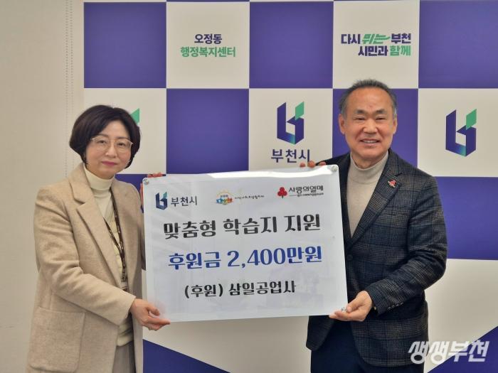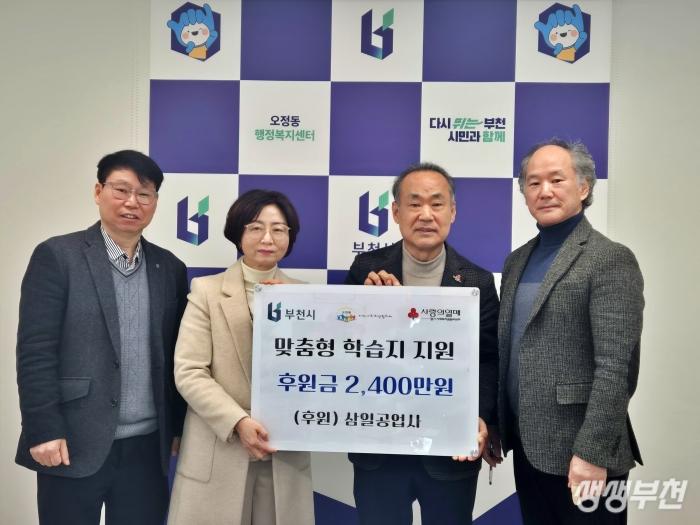 부천시 오정구 오정동(동장 오동근)은 지난 5일 삼일공업사(대표 엄정태)가 ‘맞춤형 학습지 지원’ 사업 추진을 위해 후원금 2,400만 원을 오정동 지역사회보장협의체에 기탁했다고 전했다.