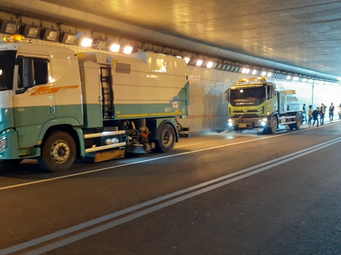 이번 청소는 △도로 관리부서 외 20명 △노면차 1대 △살수차 1대 △1톤 화물차량 3대를 동원하여 고강지하차도를 청소했다.
