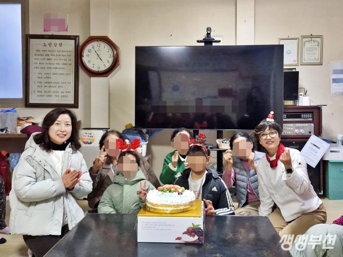 ▲ 오정제1(여)경로당에 케이크를 전달하고 있다.