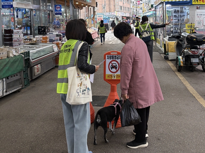 ▲ 도시미관과 직원 등이 시장 내 점포를 돌며 홍보물을 배부하고 있다.