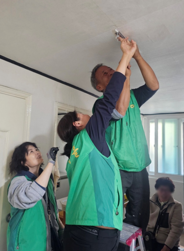 ▲ 새마을회원들이 낡은 전등을 교체하며 주거 환경 개선 봉사를 진행하고 있다.