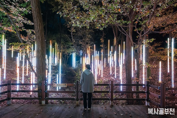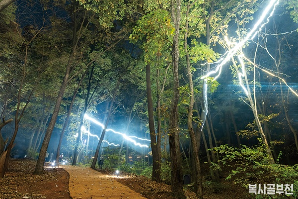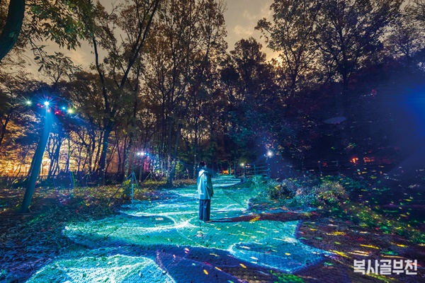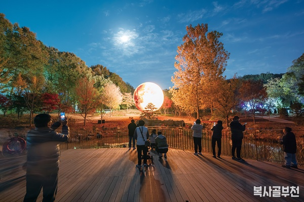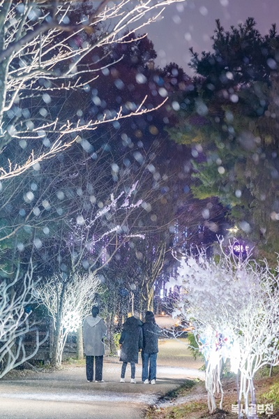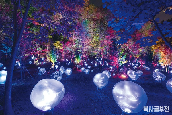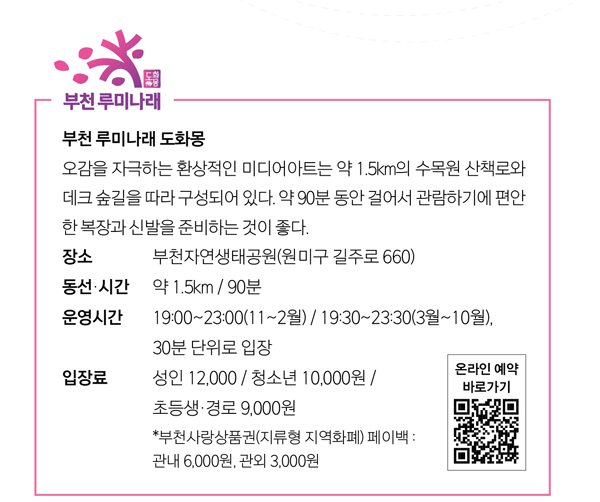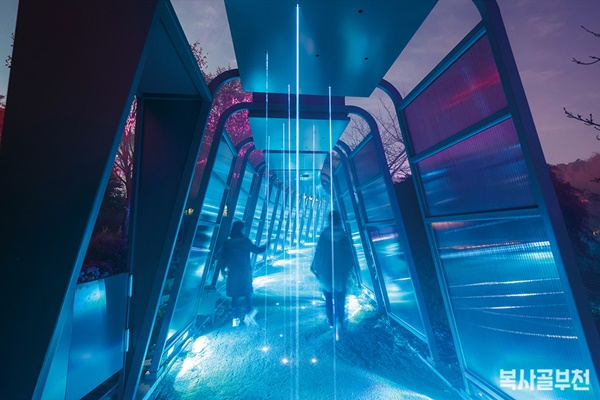어둠이 내리자 숲이 빛으로 깨어난다. 부천자연생태공원 숲길 1.5km 구간이 빛과 디지털 콘텐츠를 결합한 환상적인 미디어아트 무대로 변신한다. ‘도화몽(桃花夢, 복사꽃의 꿈)’을 테마로 한 12가지 날씨는 어떤 이야기를 들려줄까? 걸음을 옮길 때마다 바람에 살랑이는 복사꽃, 달밤을 휘감은 무지개, 은빛으로 펼쳐진 은하수가 빛과 음악, 자연과 함께 일렁인다. 빛의 날개로 밝힌 무릉도원의 겨울밤, 그 황홀한 꿈속으로 초대한다.