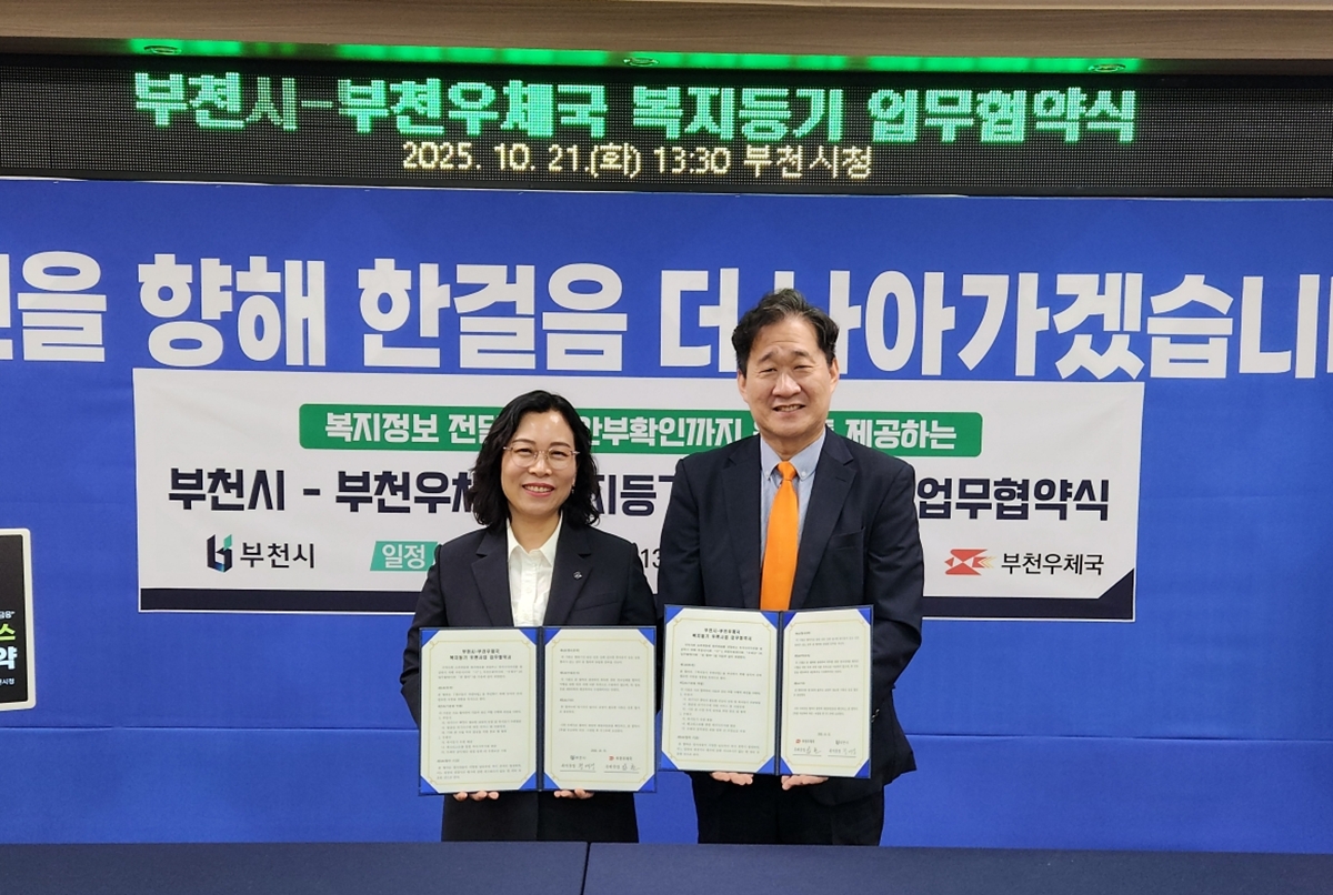부천시는 지난 21일 부천우체국과 ‘복지등기 서비스 지원’을 위한 업무협약을 맺고, 우편배송망을 활용해 복지사각지대를 발굴하고 위기가구를 지원하는 공공협력 체계를 본격적으로 가동한다.