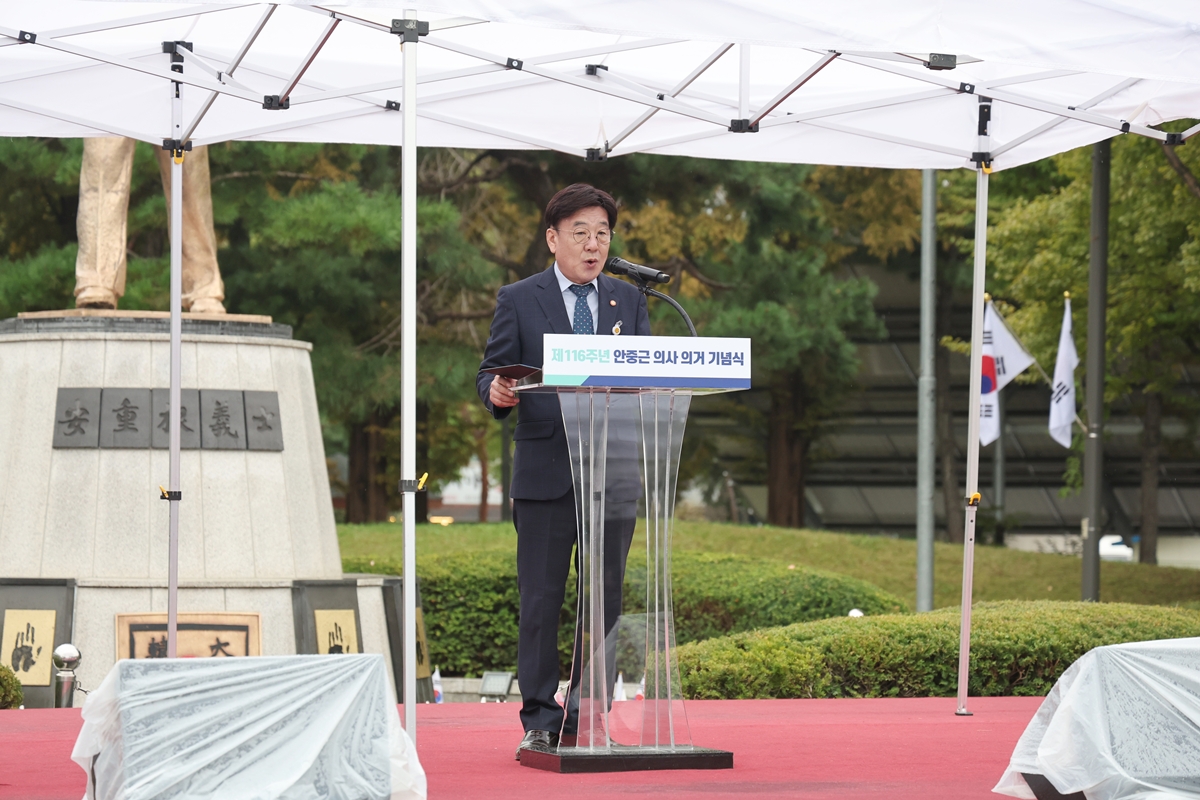 이어 안중근 의사 약전 보고와 기념사, 축사가 진행됐으며, 참석자 전원이 ‘안중근 노래’와 ‘독립군가’를 함께 제창한 뒤 만세삼창으로 행사는 마무리됐다.