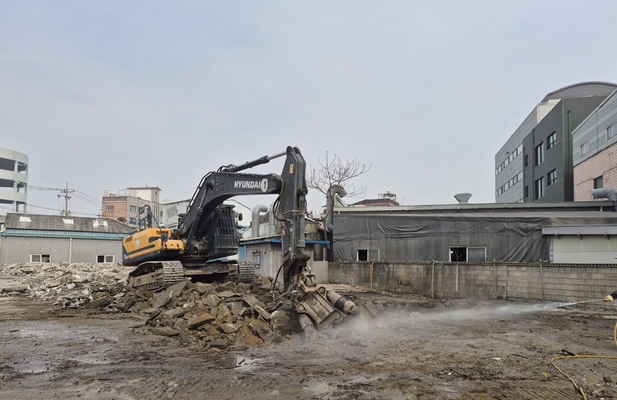 ▲공사장에서 살수 작업을 통해 비산먼지 발생을 저감하고 있다.