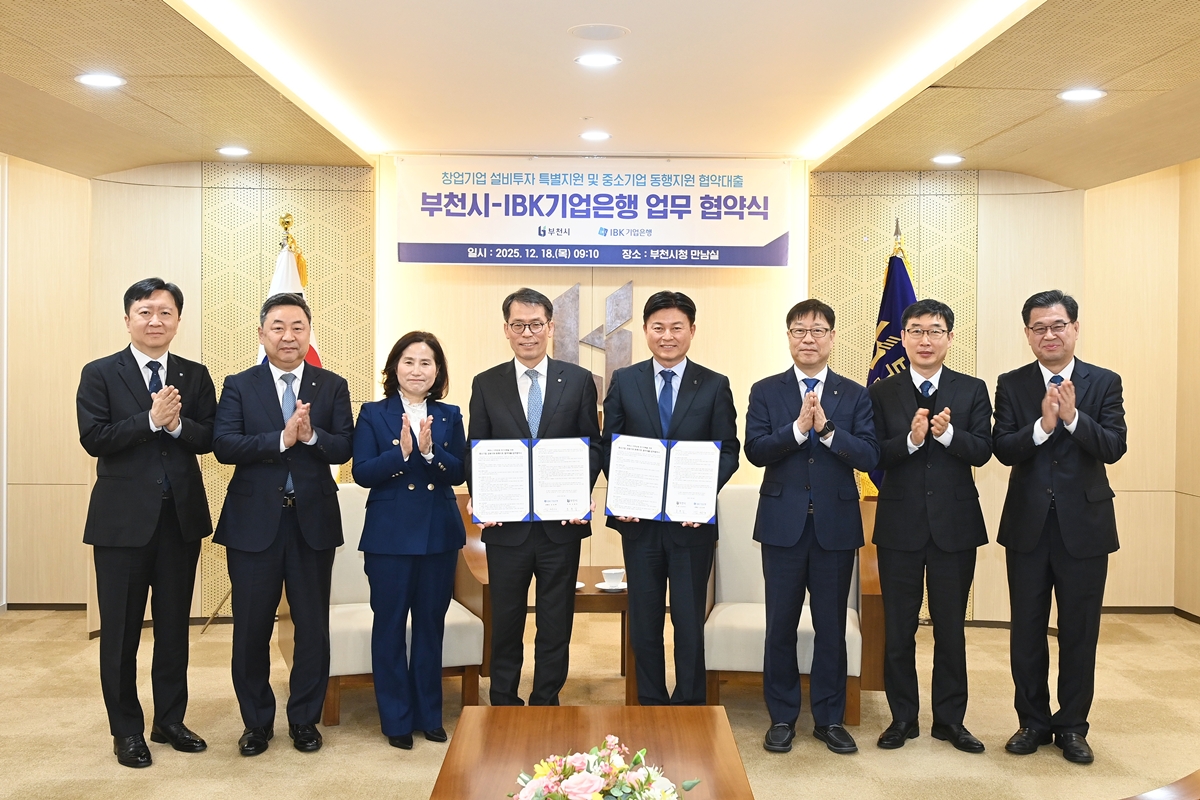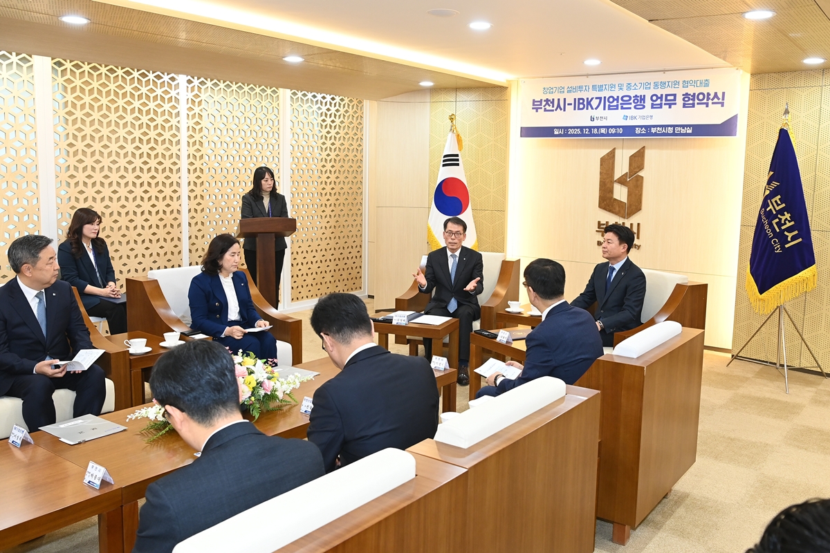 부천시와 IBK기업은행이 12월 18일 ‘창업기업 설비투자 특별지원’ 및 ‘중소기업 동행지원 협약대출’ 업무협약을 체결했다. 협약식에는 조용익 부천시장과 김성태 IBK기업은행장을 비롯한 양 기관 관계자가 참석했다.