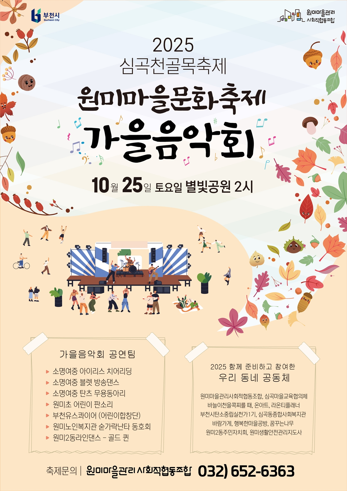부천시는 10월 25일 원미별마루와 별빛공원 일대(부천로 90번길 51)에서 ‘2025년 심곡천 골목축제–원미마을문화축제 가을 음악회’를 연다. 이번 행사는 부천시 원도심재생과가 주최하고, 원미마을관리사회적협동조합이 주관한다.