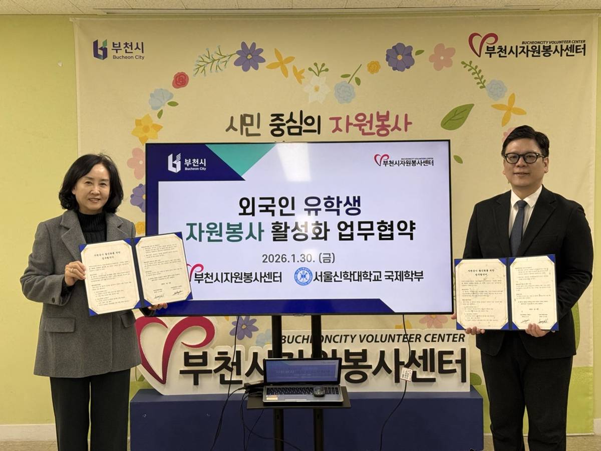 부천시는 부천시자원봉사센터가 지난 1월 30일 서울신학대학교 국제학부와 ‘해외 유학생 자원봉사 활성화’를 위한 업무협약을 체결했다고 2일 밝혔다. 이번 협약은 관내 외국인 유학생의 지역사회 참여를 넓히고, 자원봉사를 통해 안정적인 지역 정착을 돕기 위해 추진됐다.