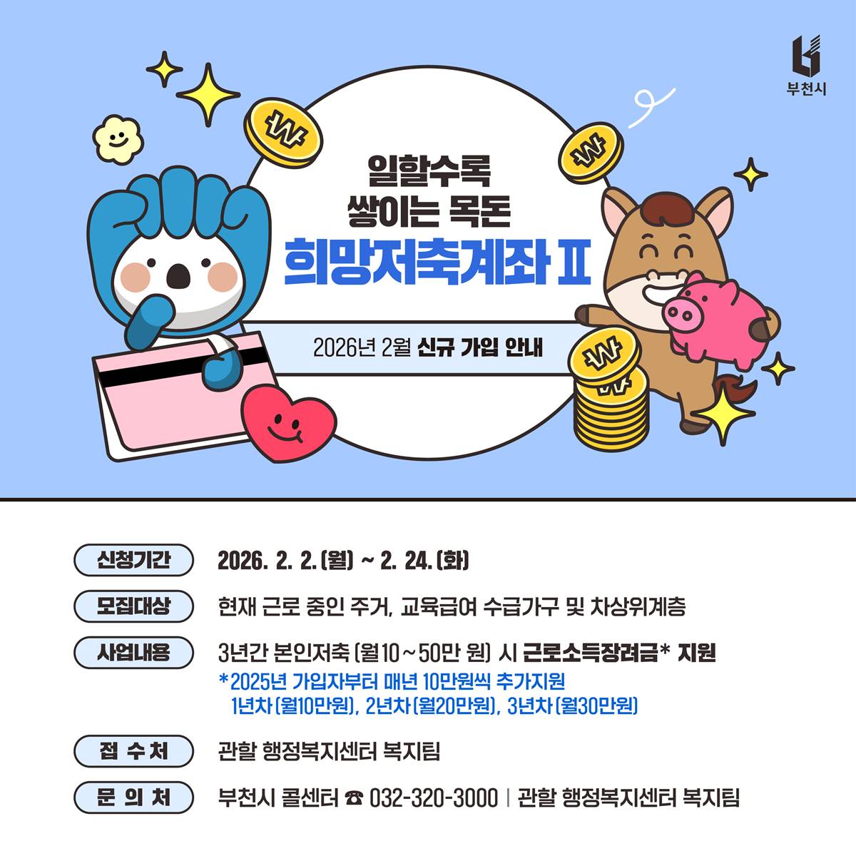 부천시는 근로 중인 주거․교육급여 수급 가구와 차상위계층의 자산 형성과 자립을 지원하기 위해 ‘2026년 희망저축계좌(Ⅱ)’ 신규 가입자를 오는 2월 2일부터 24일까지 모집한다고 30일 밝혔다.