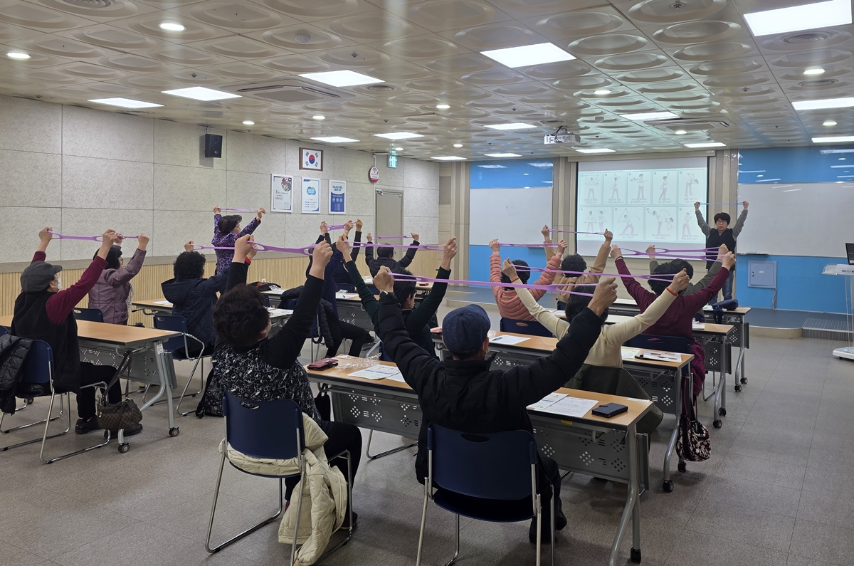 ▲ 어르신들이 ‘튼튼 시니어 운동교실’에서 탄력밴드를 이용한 운동을 하고 있다.
