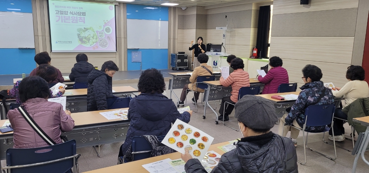 ▲ 어르신들이 ‘튼튼 시니어 운동교실’에서 영양교육을 받고 있다.