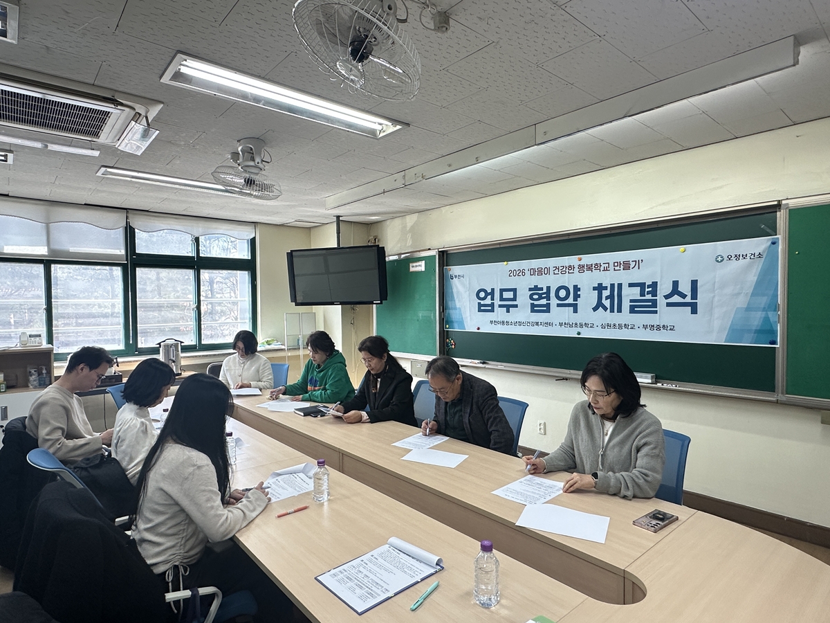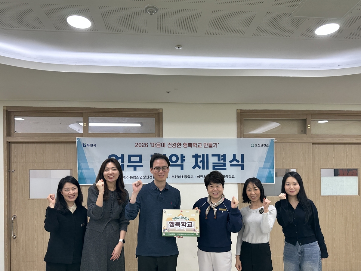 부천시와 부천시아동청소년정신건강복지센터는 부천남초등학교, 심원초등학교, 부명중학교와 ‘마음이 건강한 행복학교 만들기’ 사업의 2026년도 업무협약을 체결하고, 학교 기반 정신건강사업을 본격 운영한다.