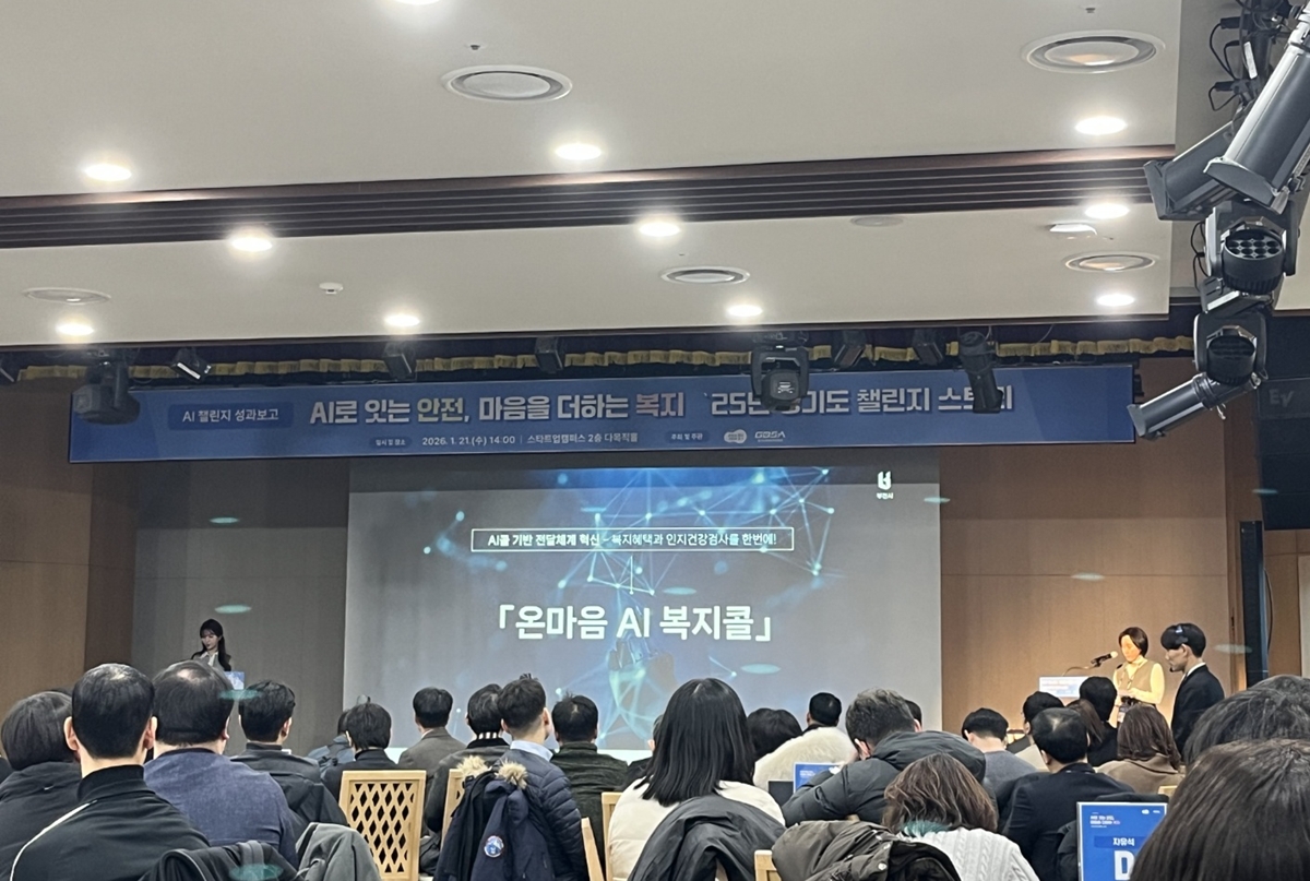 특히 취약계층 대상 대량 및 적시 복지정보 전달, 응답 기반 맞춤형 서비스 연계, AI콜 기반 비대면 인지건강 단축검사 운영 등의 성과를 중심으로 발표해 공공분야 AI 기술 활용 가능성에 대한 관심을 모았다. 행사장 로비에 마련된 AI 챌린지 성과 체험부스에서는 ‘온마음 AI복지콜’의 현장 시연도 함께 진행돼 참여자들의 이해를 도왔다.