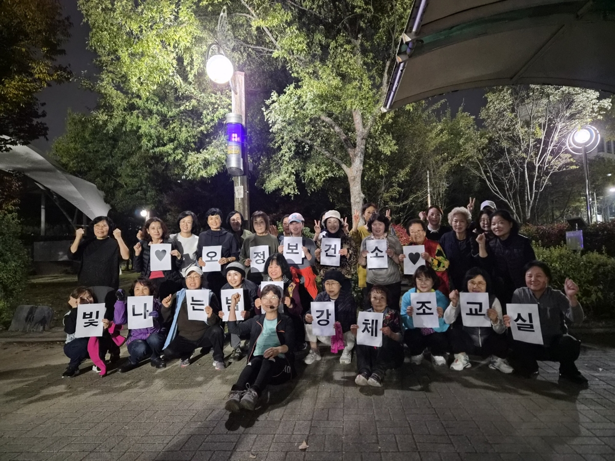 ▲  ‘빛나는 밤, 건강체조교실 2기’ 프로그램에 참여한 시민들이 기념사진을 찍고 있다.