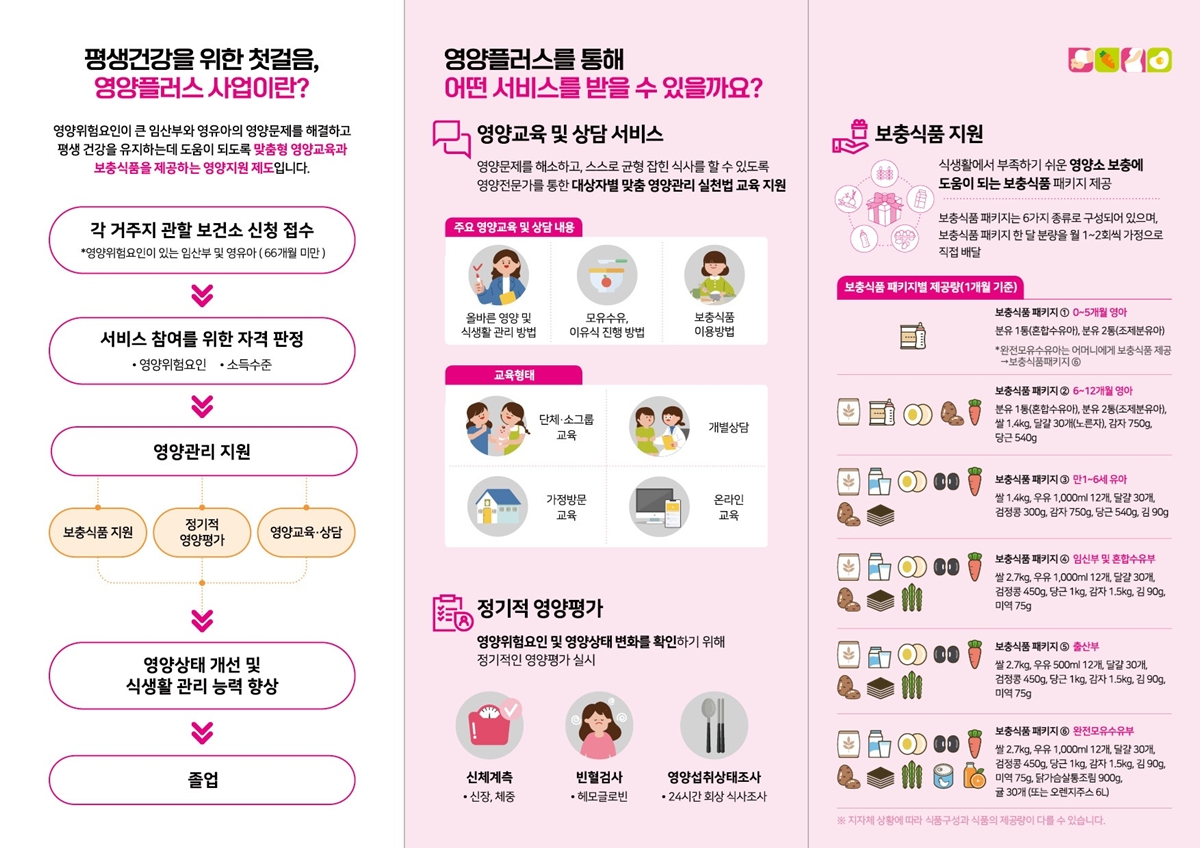 선정된 대상자에게는 6종의 보충식품 패키지 중 개인별 맞춤형 식품 패키지를 월 2회 제공하고, 영양상담과 교육, 영양평가 등 서비스도 함께 지원한다. 다만 저소득층 기저귀·조제분유 지원사업으로 조제분유를 지원받는 경우와 임신부 친환경 농산물 꾸러미 사업 참여자는 중복 지원이 제한된다.
