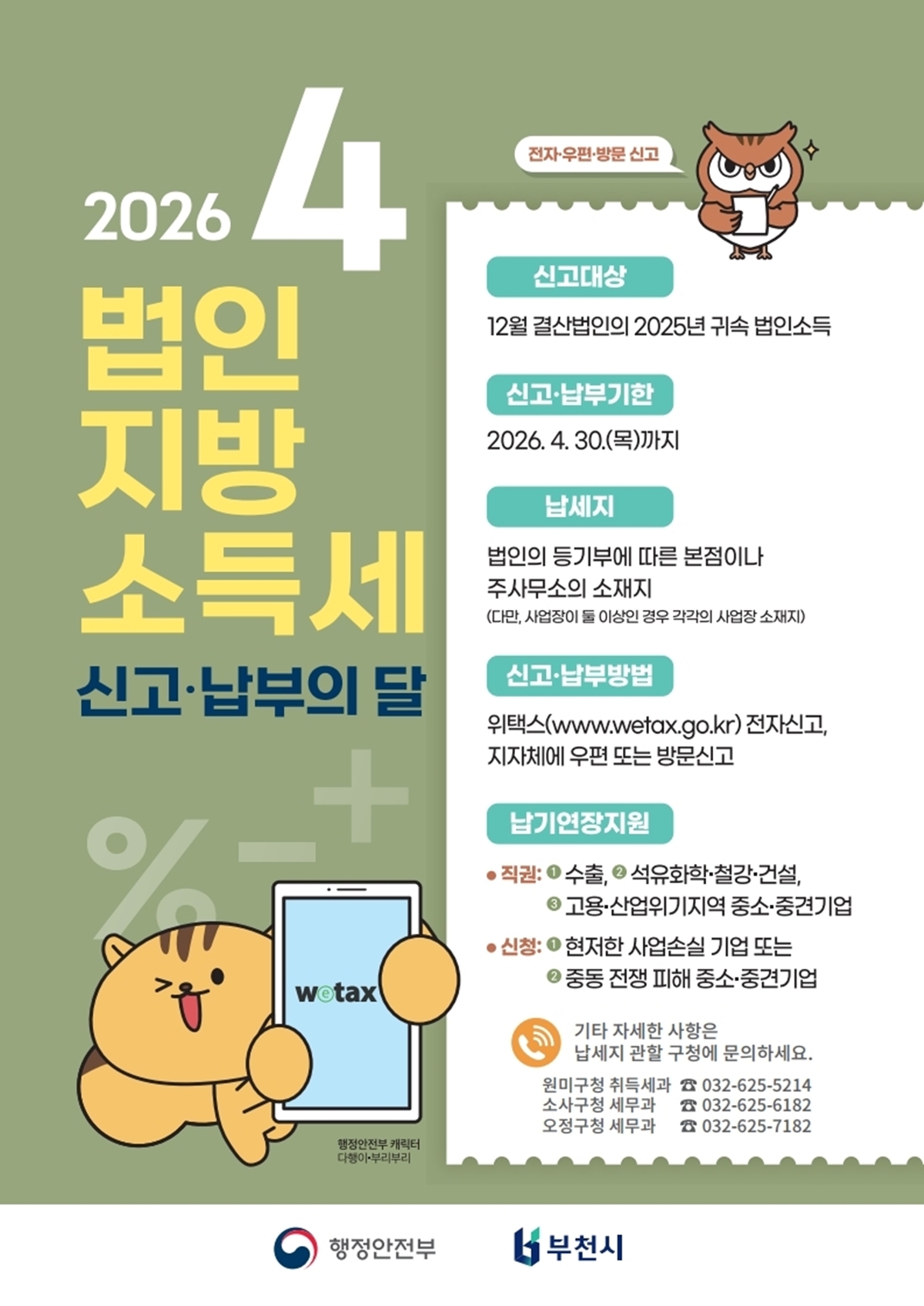 신고 대상은 지난해 12월 말 기준 부천시에 사업장을 둔 모든 법인이며, 지난해 귀속 소득이 없거나 결손이 발생한 경우에도 신고해야 한다. 신고는 위택스를 통한 전자신고 또는 사업장 소재지 관할 구청 방문 및 우편으로 가능하다.