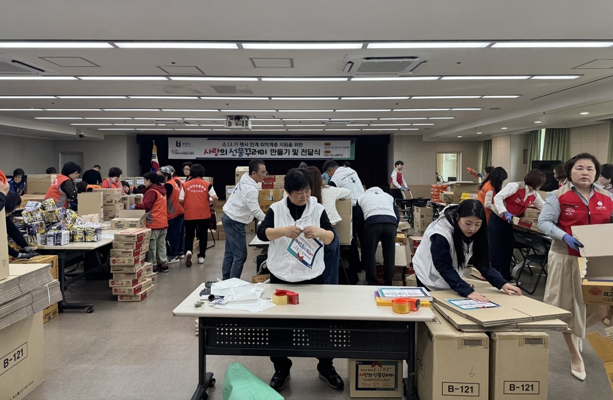 ▲ 자원봉사자들이 ‘사랑의 선물꾸러미’ 포장 작업을 하고 있다.