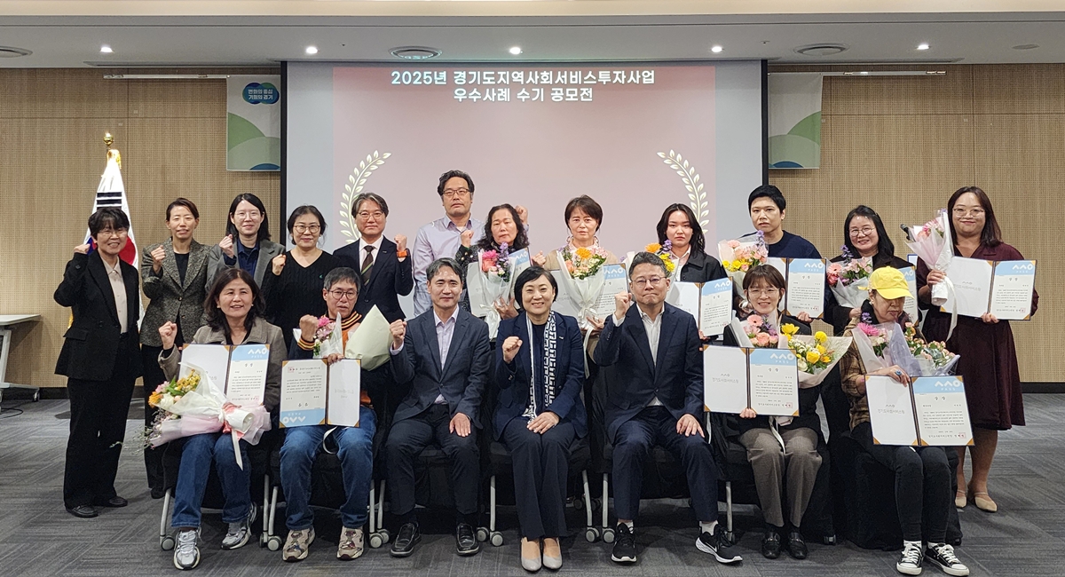 ▲ ‘경기도지역사회서비스투자사업 우수사례 수기 공모전’ 수상자들이 단체사진을 찍고 있다.