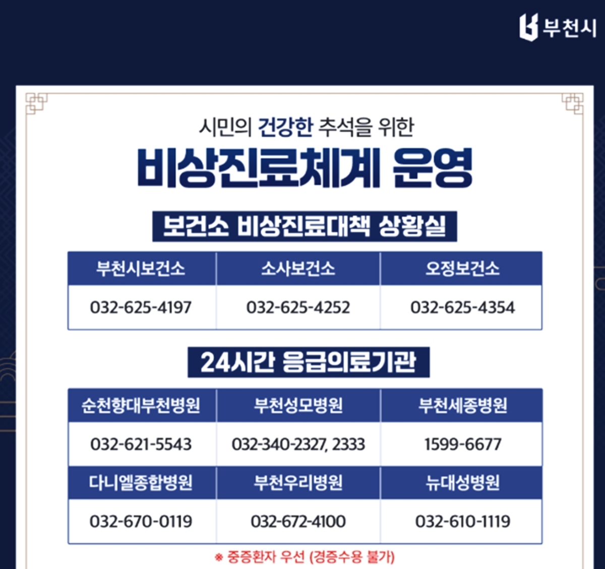 응급환자와 진료가 필요한 시민을 위해 응급의료기관은 24시간 운영하고, 병·의원과 약국은 참여 희망일에 문을 열어 시민들이 필요할 때 의료서비스를 이용할 수 있도록 지원해 의료서비스 공백을 최소화할 계획이다. 부천시는 이와 함께 연휴 기간 중 발생할 수 있는 각종 상황에 신속히 대응하기 위해 보건소 내에 ‘비상진료상황실’을 설치해 운영한다.