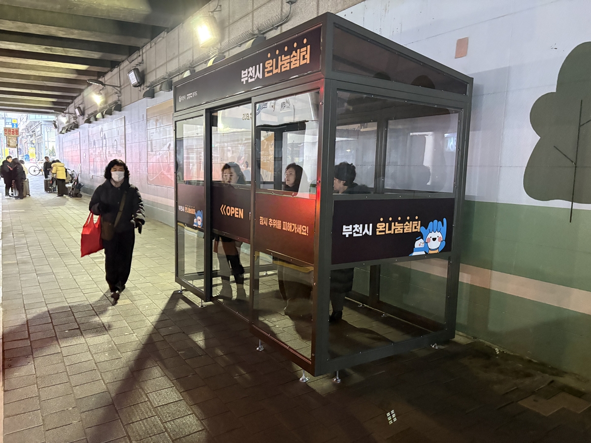 ▲ 시민들이 소사역지하차도 버스정류장 온나눔쉼터에서 추위를 피하고 있다.