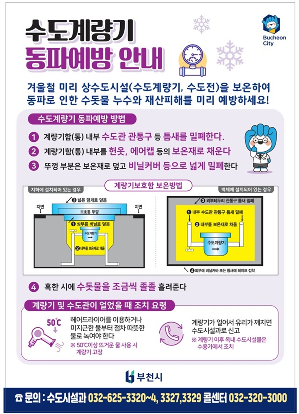 한파나 수도 동파로 인한 불편 사항이나 긴급 상황이 발생할 경우, 부천시 수도시설과 상황실(032-625-3320~4)로 신고하면 된다.
