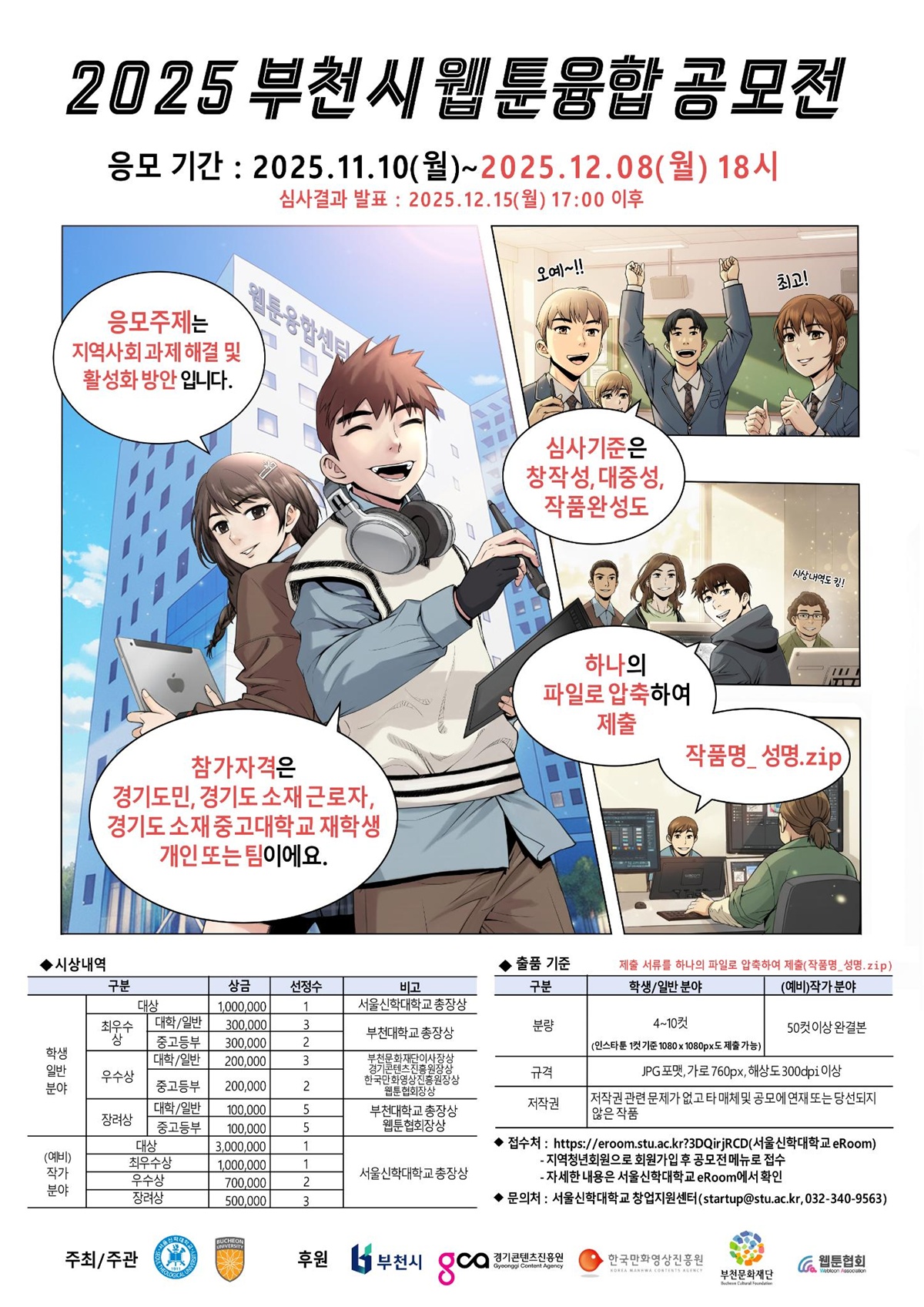 부천시는 11월 10일부터 12월 8일까지 서울신학대학교 ‘이룸(eRoom)’ 플랫폼을 통해 지역 웹툰 창작 생태계를 조성하고 차세대 창의인재를 발굴하기 위한 ‘2025 부천시 웹툰융합공모전’을 개최한다.