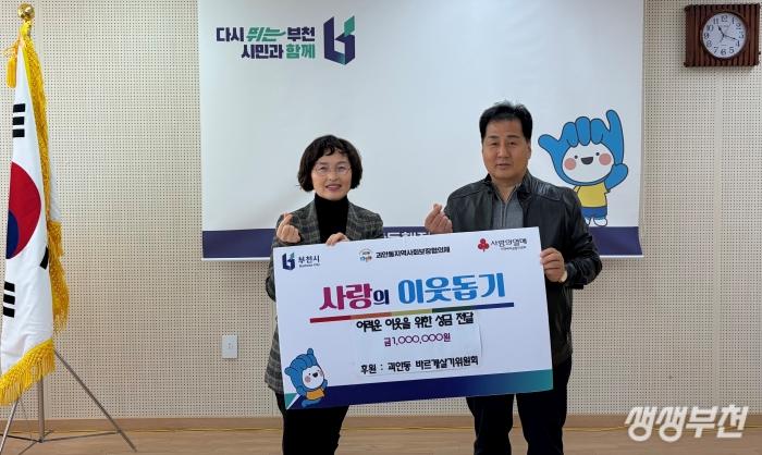 부천시 소사구 괴안동(동장 김정란)은 지난 26일 괴안동 바르게살기위원회(위원장 김동구)로부터 겨울철 취약계층을 위한 ‘사랑의 이웃돕기 성금’ 100만 원을 기탁받았다고 밝혔다.