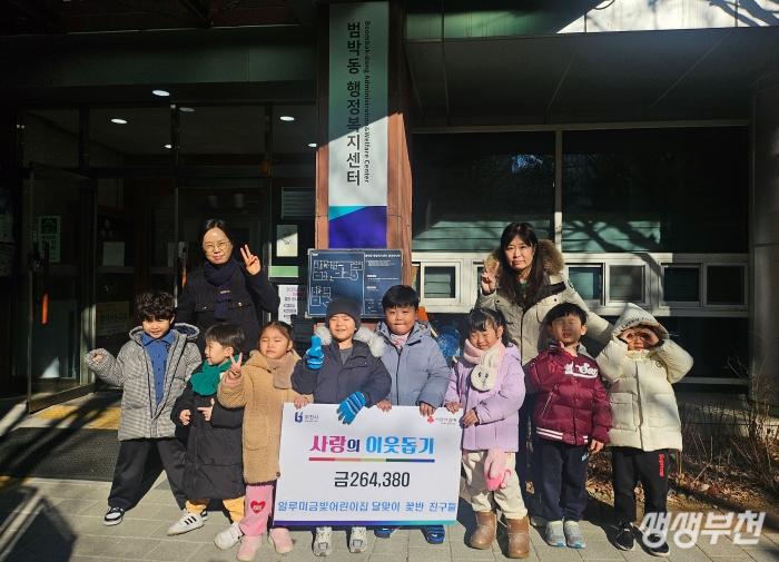부천시 소사구 범박동(동장 전미애)은 지난 5일 관내 일루미금빛어린이집(원장 이향옥) 달맞이꽃반 원아들이 이웃돕기 성금 26만 4,380원을 기탁했다고 밝혔다.