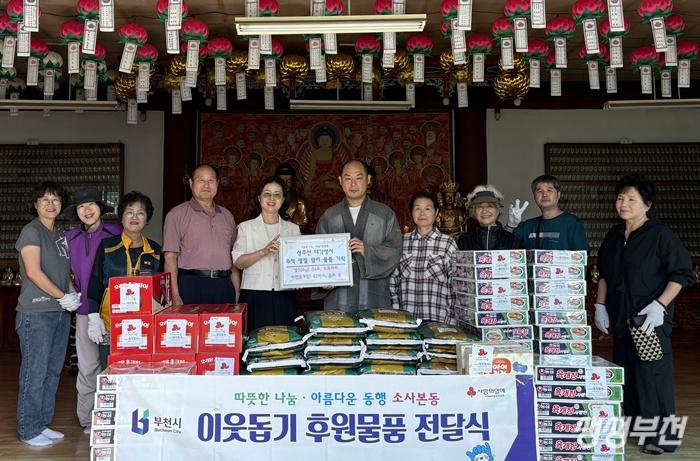 부천시 소사구 소사본동(동장 이영미)은 지난 2일, 대각정사(주지 지견스님)가 추석 명절을 맞아 어려운 이웃을 위해 백미 34포, 라면 42박스, 초코파이 선물세트 13박스, 음료세트 22박스 등 후원물품을 전달했다고 밝혔다.