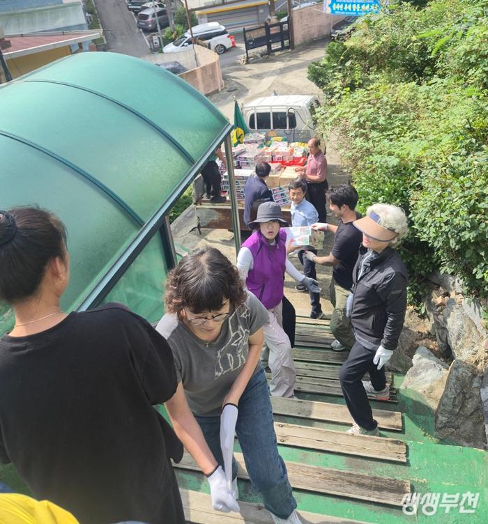 ▲대각정사에서 후원한 이웃돕기 물품을 나르고 있는 자원봉사자들