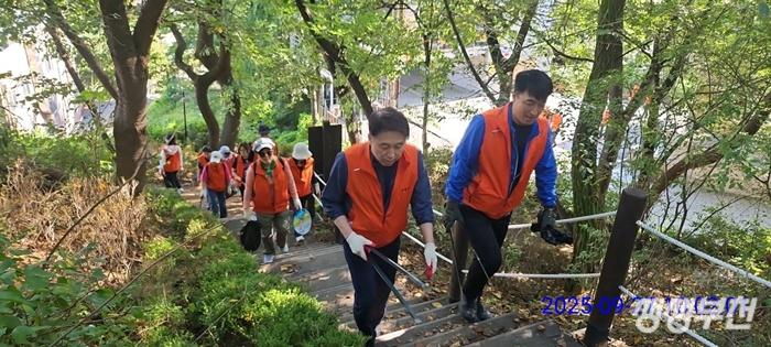 ▲ 송내2동 단체원들이 쓰레기 수거를 위해 등산로를 오르고 있다