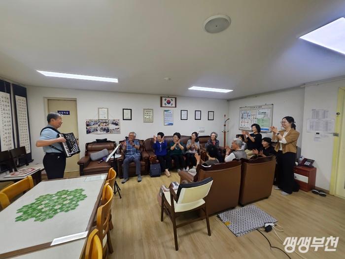 ▲ 어르신이 아코디언을 연주하여 함께 즐기고 있다.