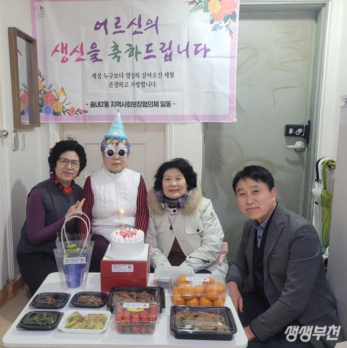 부천시 소사구 송내2동 지역사회보장협의체(위원장 임병례)는 지난 8일 관내 홀로 사는 저소득 어르신을 찾아가 생신잔치를 진행했다.