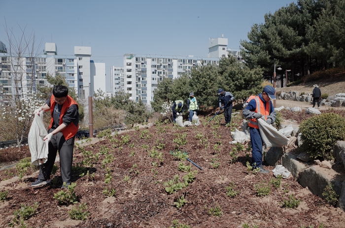 특히 송내2동은 식재와 더불어 약 600㎡ 규모의 식재지 전역에 5~10cm 두께의 바크 멀칭(Mulching) 작업을 실시했다. 이를 통해 토양 수분 증발을 억제하여 고사를 방지하고, 잡초 생장을 막는 등 수국이 안정적으로 뿌리를 내릴 수 있는 생육 기반을 조성했다.