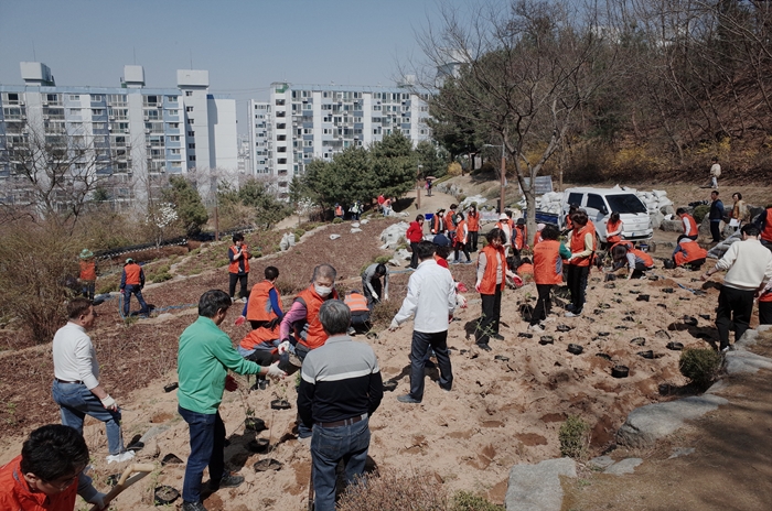 ▲송내2동 주민들이 송내공원 일원에서 '라임라이트' 수국을 식재하며 총 900주 규모의 수국동산을 조성하고 있다.