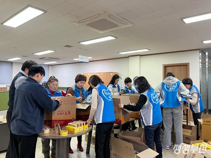 ▲ 중3동 지역사회보장협의체 위원들이 온기가득 선물상자를 포장하고 있다.