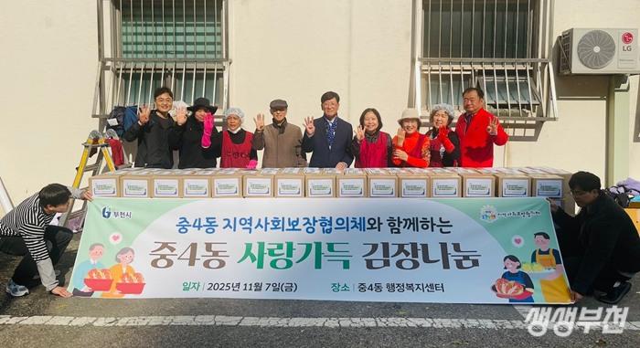 부천시 원미구 중4동(동장 김은주)은 지난 7일 지역사회보장협의체(위원장 은완기)가 ‘사랑가득 김장나눔 행사’를 진행했다고 밝혔다.