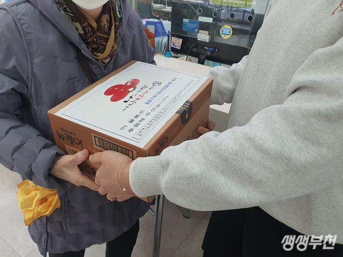 ▲ 어르신에게 뉴케어를 전달하고 있다.