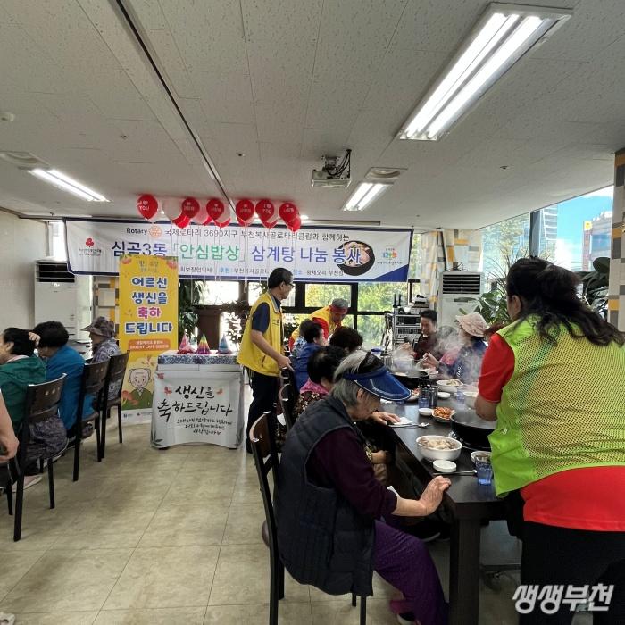 부천시 원미구 심곡3동 지역사회보장협의체(공동 위원장 양왕덕, 이은주)는 지난 10월 15일, 부천복사골로타리클럽(대표 최동경)의 후원으로 관내 황제오리 부천점에서 어르신 30명을 초대해 건강 삼계탕 한 그릇씩을 대접했다.