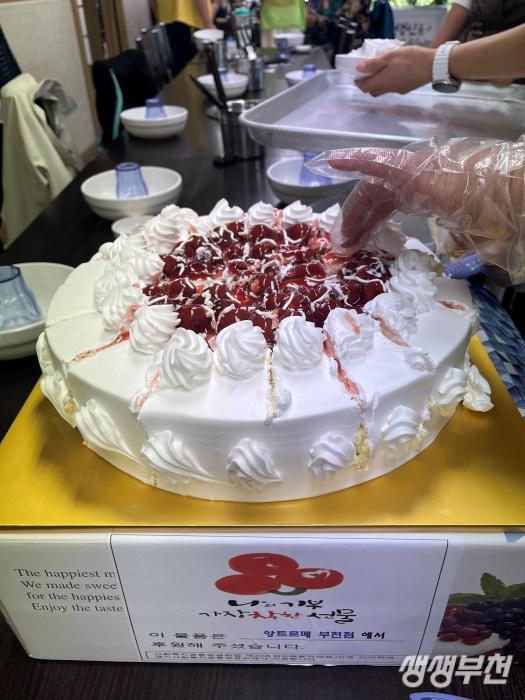 특히, 이날 행사에는 10월 생일을 맞이한 어르신들을 위한 축하 시간도 마련되었다. 생일케이크는 관내 나눔가게 협약 기관인 앙트르메 제과점(대표 박병삼)에서 30명이 나눠먹을 수 있는 특별제작 대형케이크(환산가액 20만 원)를 선뜻 후원함으로써, 참석자들이 함께 노래를 부르고 축하인사를 나누는 자리가 됐다.