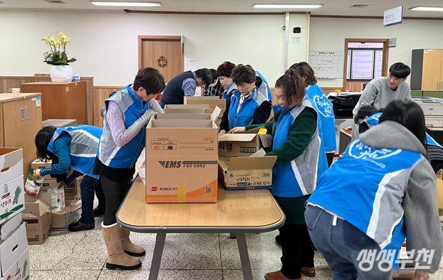 ▲ 중3동 지역사회보장협의체 위원들이 사랑의 선물상자를 포장하고 있다.