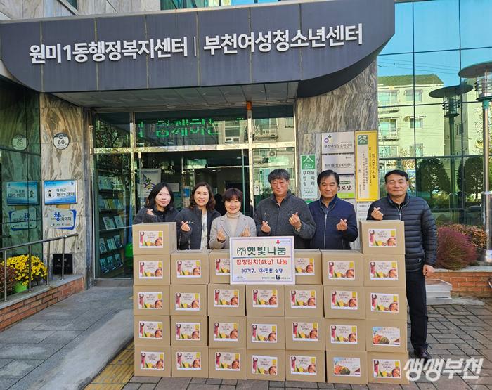 ▲ ㈜햇빛나눔이 취약계층을 위해 직접 담근 김치(120kg)를 원미1동에 전달했다.