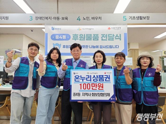 부천시 원미구 중4동 지역사회보장협의체(위원장 은완기)는 지난 29일 다가오는 추석 명절을 앞두고 관내 저소득 취약계층 20가구에 온누리상품권 100만 원을 전달했다고 밝혔다.