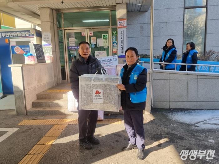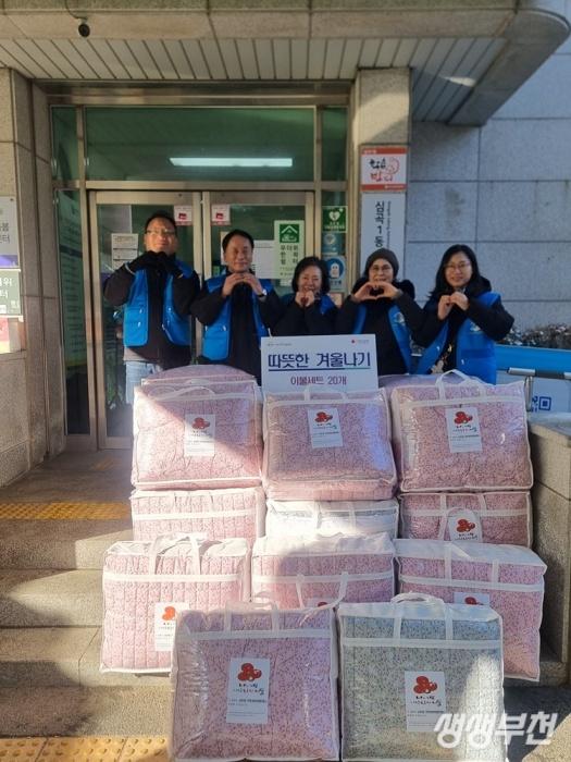 ▲ 지난 5일 심곡1동 지역사회보장협의체(위원장 이천배)는 관내 저소득 독거 어르신 등 20가구에 이불세트를 전달했다.