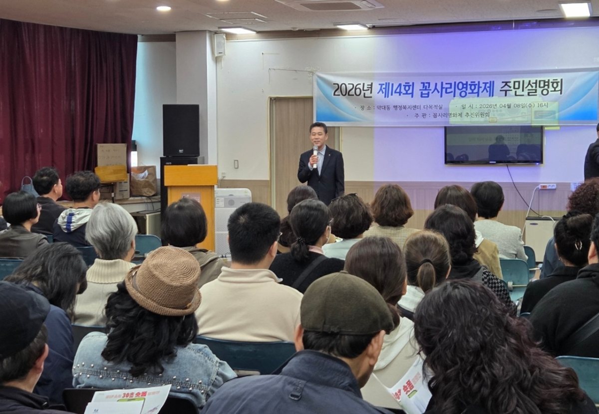 이번 설명회는 제14회 꼽사리영화제의 성공적인 개최를 위해 추진방향을 공유하고 주민들의 주도적인 참여를 확대하고자 마련된 가운데, 약 60여 명의 주민과 관계자들이 참석해 높은 관심 속에서 진행되었다.