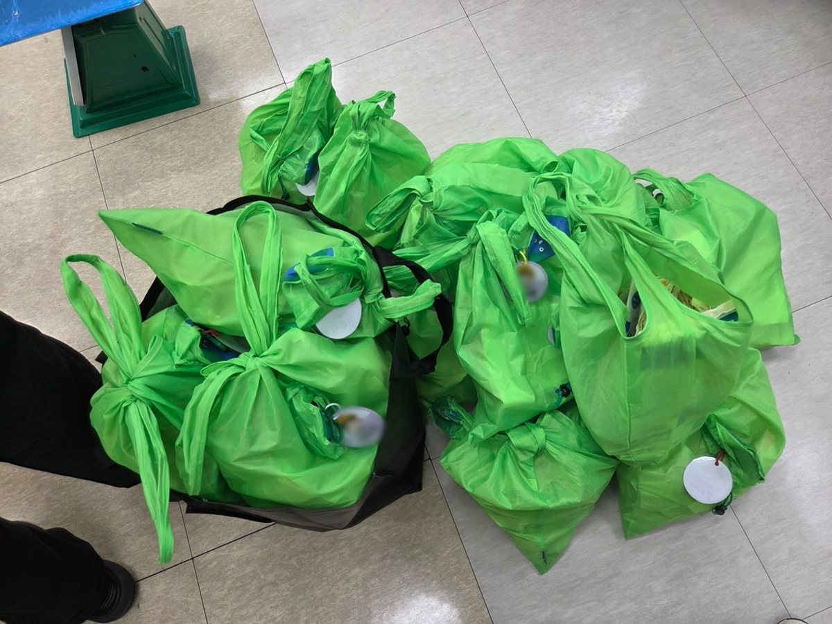 ▲원아들이 가져온 우유팩을 저울에 계량하는 모습