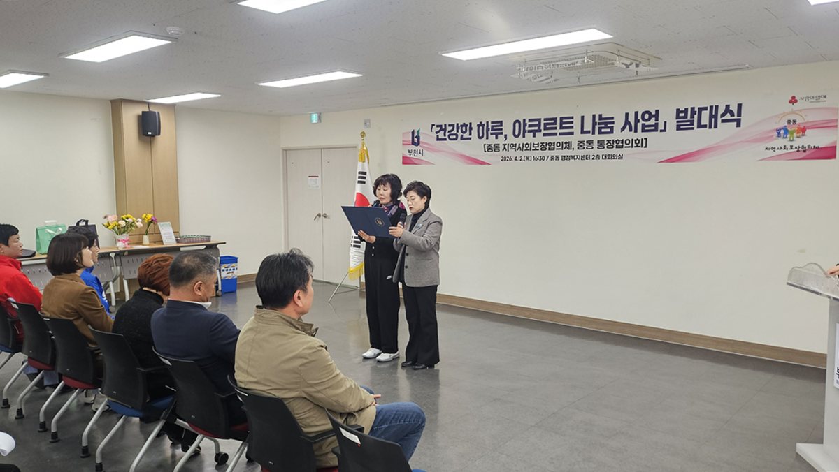 부천시 원미구 중동 지역사회보장협의체(위원장 김영철)와 통장협의회(회장 신언숙)는 지난 2일 중동행정복지센터 대회의실에서「건강한 하루, 야쿠르트 나눔 사업」발대식을 개최했다고 밝혔다.
