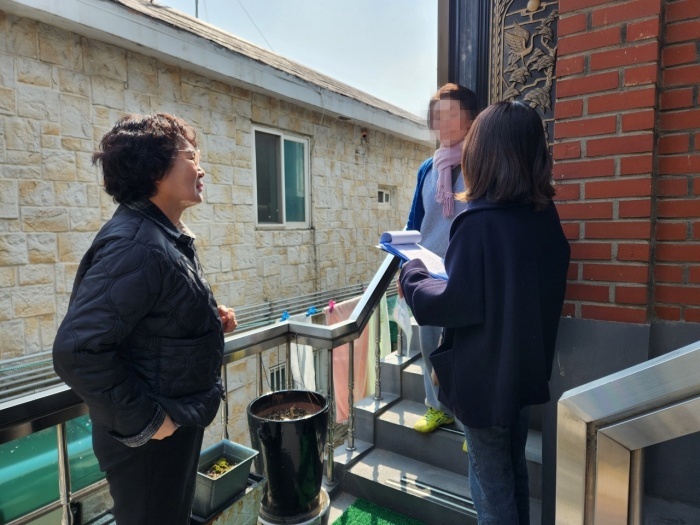 ▲ 지역사회보장협의체 김순전 위원과 집주인에게 사업취지를 설명하는 모습