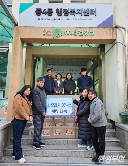 부천시 원미구 중4동(동장 김은주)은 지난 1일 ㈜햇빛나눔(대표 송봉철)에서 관내 취약계층을 위해 4kg 김장김치 30상자를 기탁했다고 밝혔다.