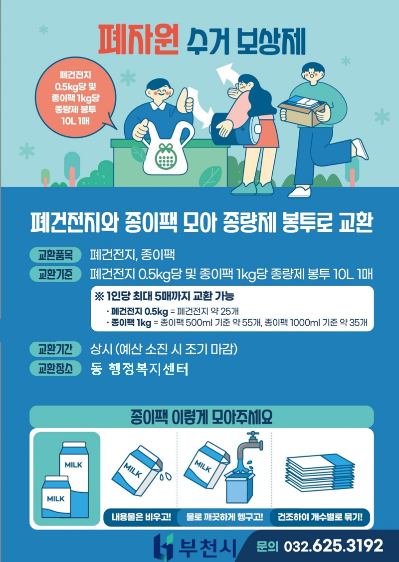 아직, 폐자원 수거 보상제를 모르고 있다면, 지금부터 폐건전지와 종이 팩을 모아서 인근 동 행정복지센터에서 종량제 봉투로 교환하자.